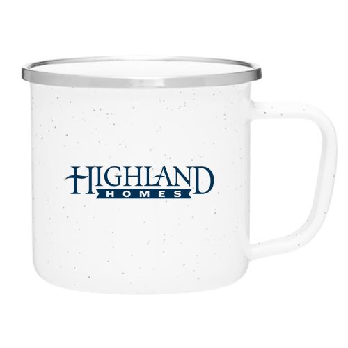 13 oz single wall enamel mug with glossy color out/ glossy white in, 18/8 stainless steel rim, and speckles