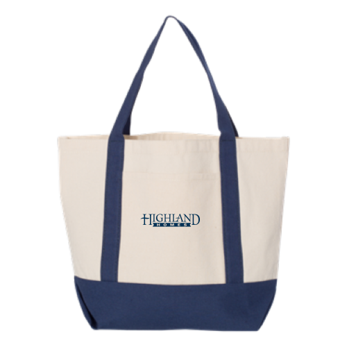 11.0 oz., 100% cotton canvasExternal pocketContrast handles and gusset bottomSize: 14" x 9" x 5"